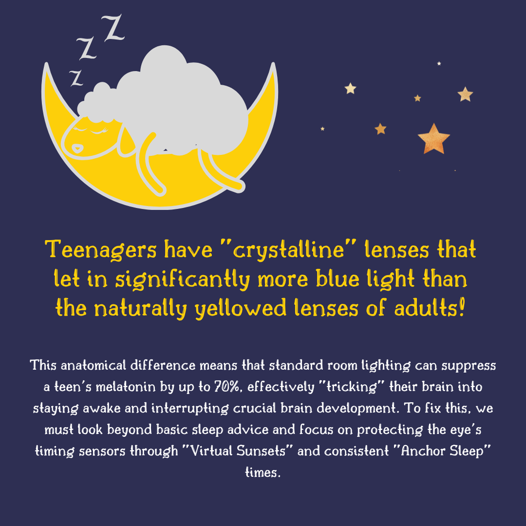 Because the teen eye is hyper-sensitive, standard adult sleep hygiene often falls short. The goal is to create a "virtual sunset" that respects their unique threshold for light.