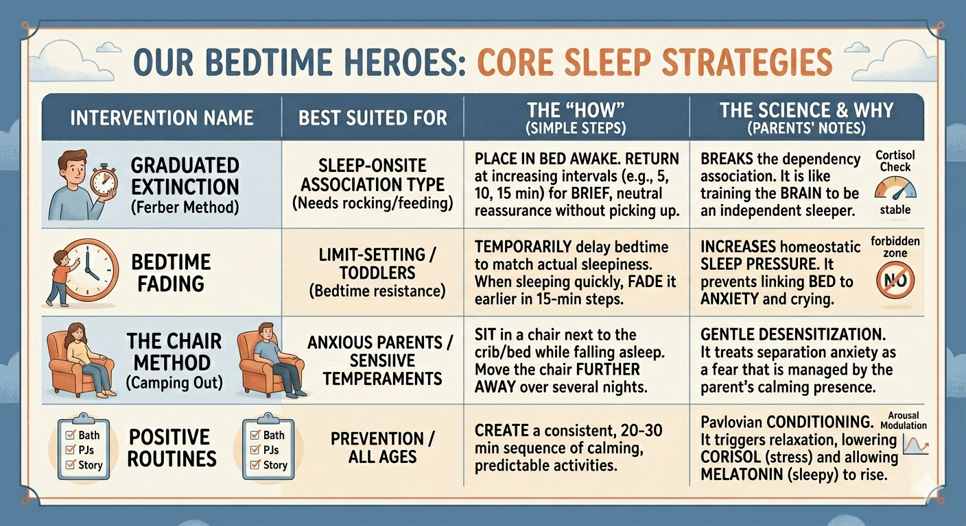This is based on Gradual Desensitization. It treats the "separation anxiety" or "fear of the dark" as a phobia that is mitigated by the parent’s presence. By slowly withdrawing the "safety cue" (the parent), the child learns to tolerate the sleep environment independently.