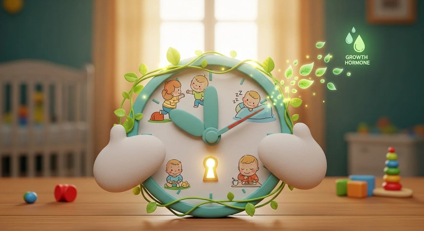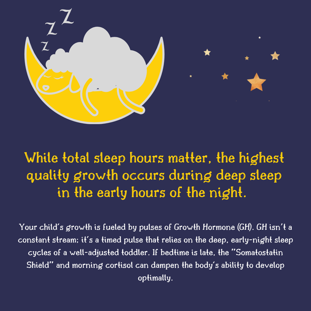 Pulse Fragmentation: For GH to do its best work, it needs sustained Slow-Wave Sleep (SWS). A toddler who goes to bed at 11 PM is often in a state of "over-arousal." This leads to more tossing, turning, and "micro-awakenings." Every time the child shifts out of deep sleep, the GH pulse is interrupted. Instead of one giant, effective surge, you get several small, weak ones.